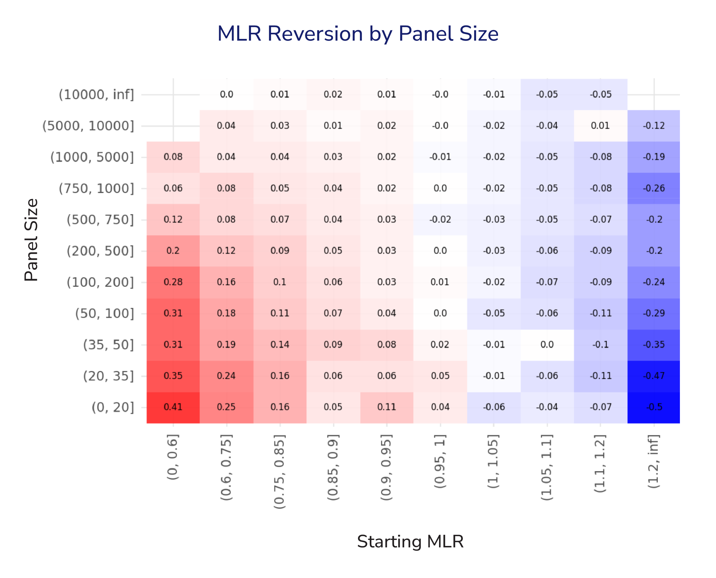 The heatmap shows the empirically observed reversion impact mean across combinations of panel size and starting MLR. It provides a granular view of how performance is expected to move back toward the CMS program mean of 1.00, and it highlights that reversion is both asymmetric and conditional.