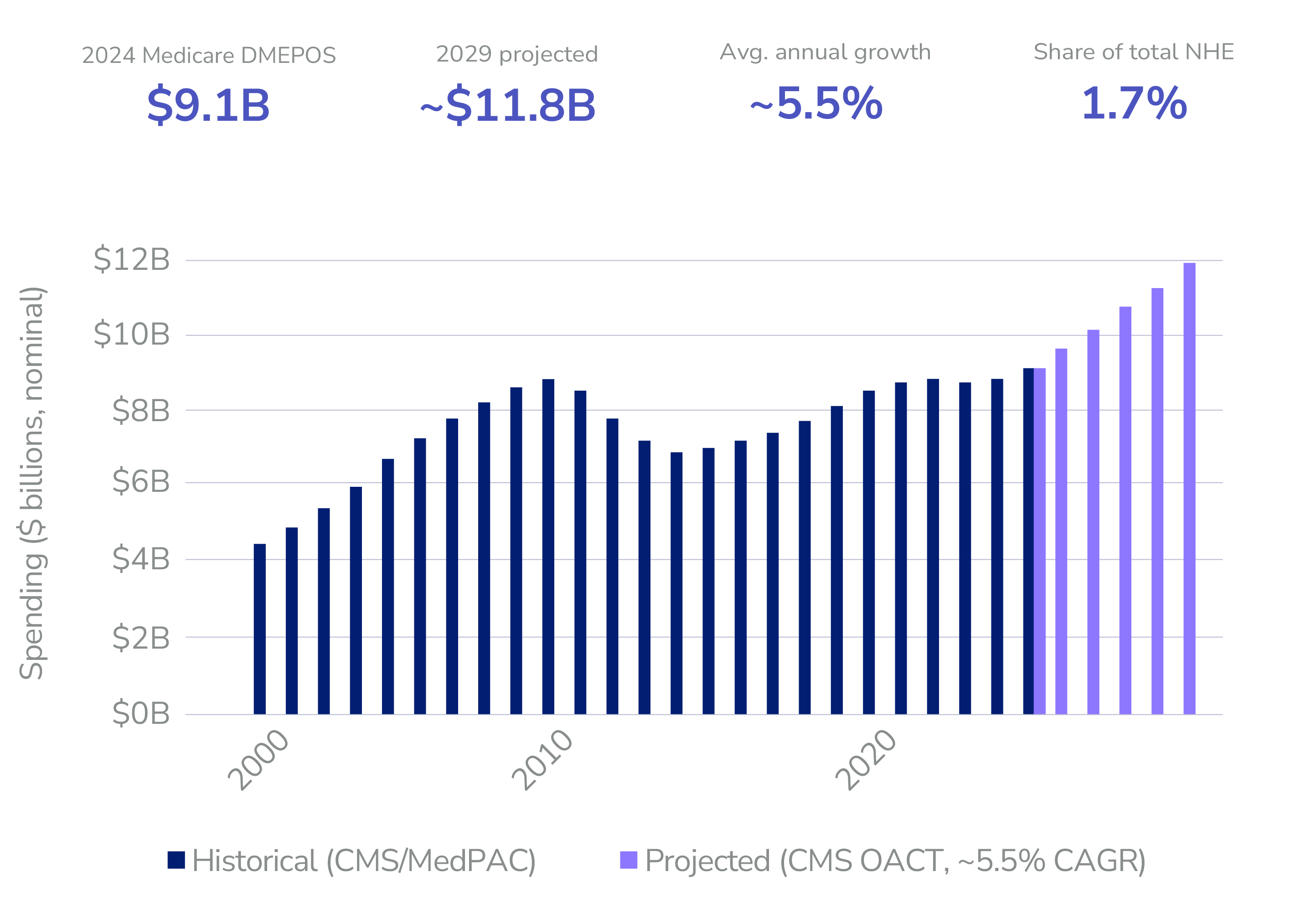 DME providers sit entirely outside this risk structure today: paid fee-for-service with no accountability for outcomes and no formal integration with ACO care teams. Durable Medical Equipment (DME) represents approximately 1.5% to 1.7% of total Medicare spending. As of recent 2024 projections, this expenditure equals roughly $9.1 billion, with spending projected to exceed $12 billion by 2030.