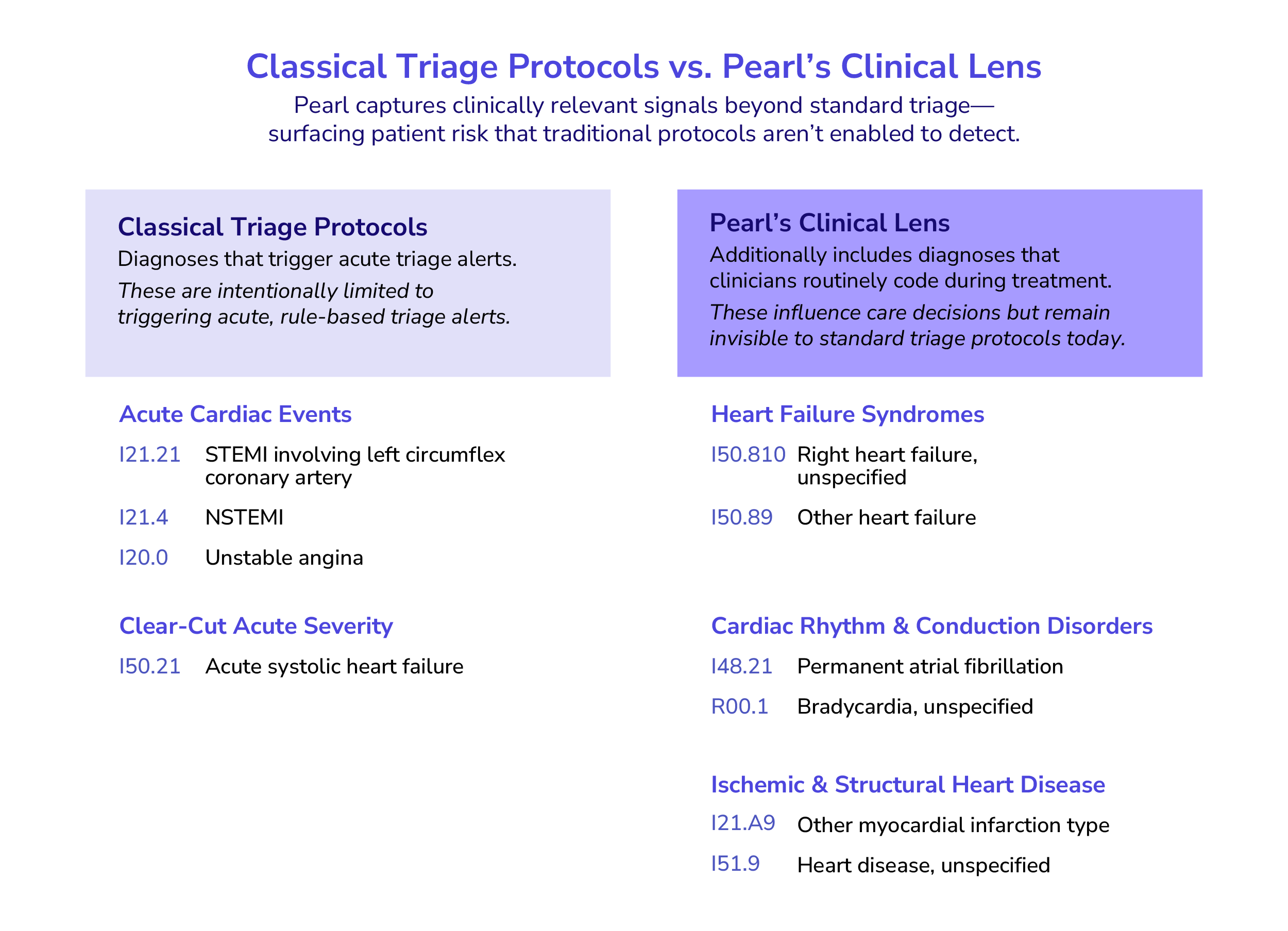 If bradycardia alone is coded, a patient may not be flagged as high risk under traditional rules. Pearl’s clinical embeddings group these related arrhythmia symptoms together, allowing care teams to identify at-risk patients who might otherwise be missed.