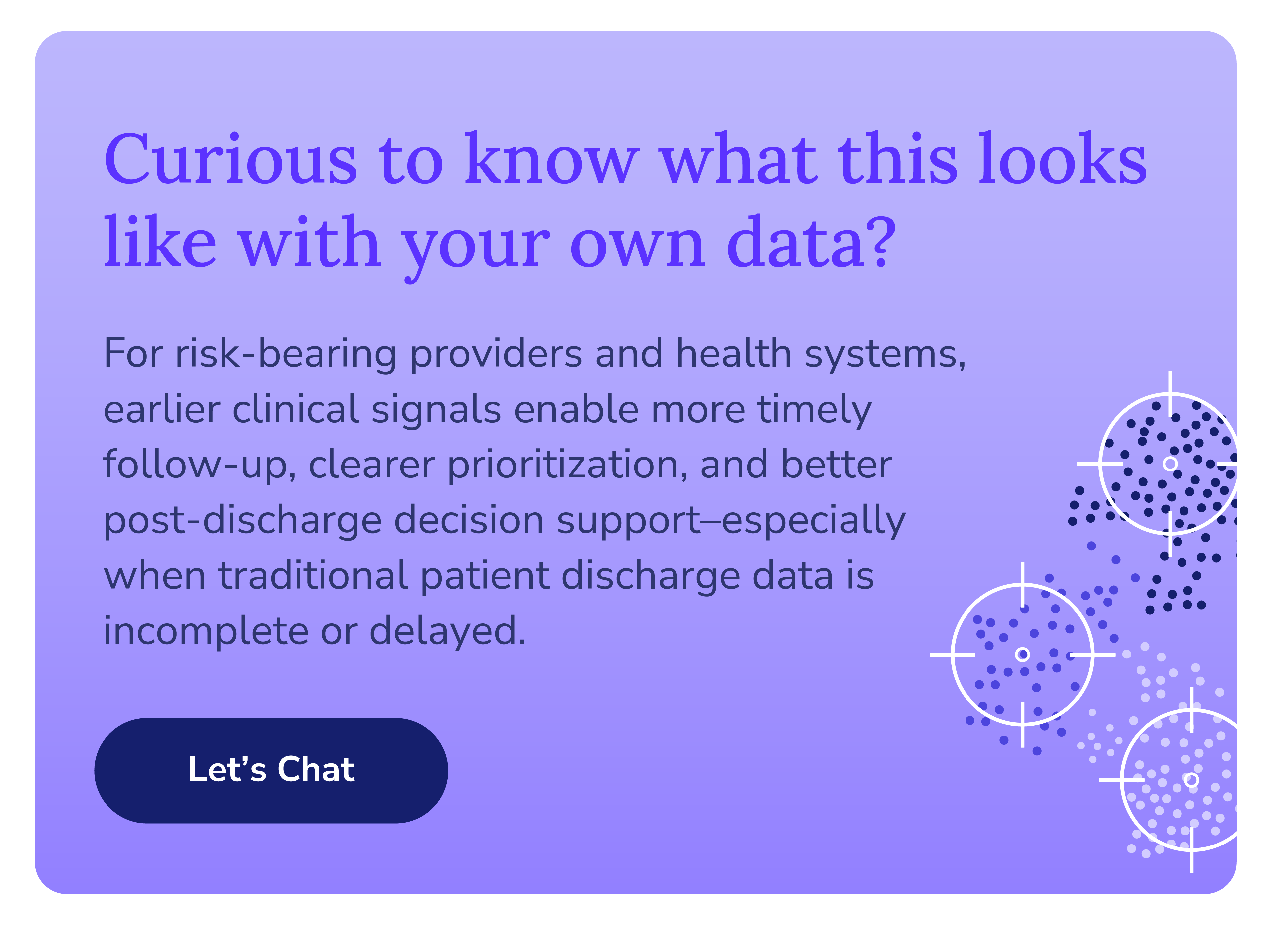 Traditional approaches to identifying discharges often rely on Admission, Discharge, and Transfer (ADT) data. While ADT feeds signal a patient’s discharge, diagnoses and severity information are often delayed or missing. This makes it challenging for care providers to prioritize and personalize post-acute interventions.