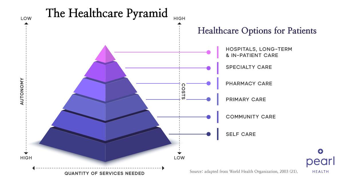 See the adapted graphic below from the World Health Organization. The more we can pull care delivery down the triangle, the more we can obviate the need for unnecessary expense. As patient needs become more acute, we must focus on lower cost, but effective, treatments — especially via primary care.